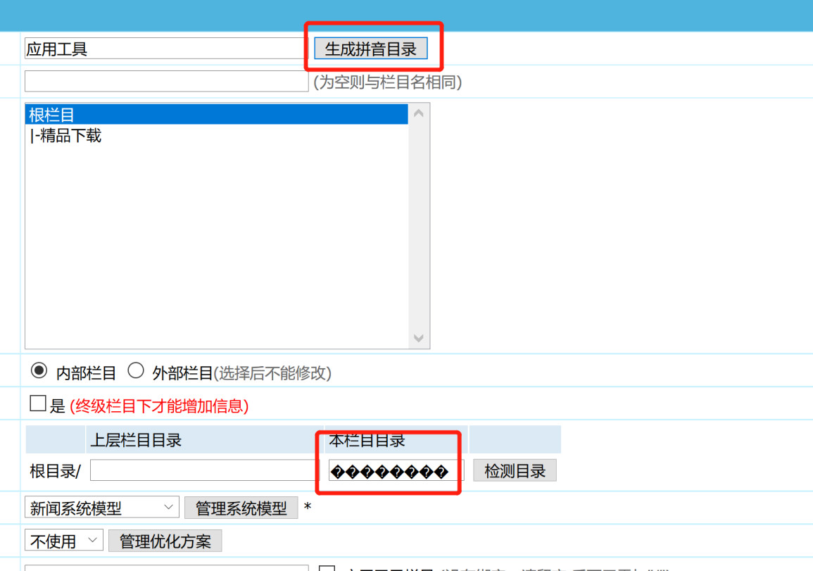 后台新增栏目的时候,生成拼音目录乱码,如图 上传以下图片: